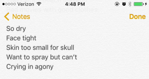 I figured my skin would eventually regulate itself, but at the same time, what if it overproduced sebum to compensate and I broke out? (Back to my notes: "I can't break out—I just got back on Tinder.") In fact, there was generally a whole lot of apprehension about how my complexion would retaliate when it wasn't being coddled with peptides and more vitamins than a GNC. ("Fearful of the sun but also scared of pollution but can't wear more makeup as barrier because it won't blend, and there's nothing worse than death-mask makeup.")